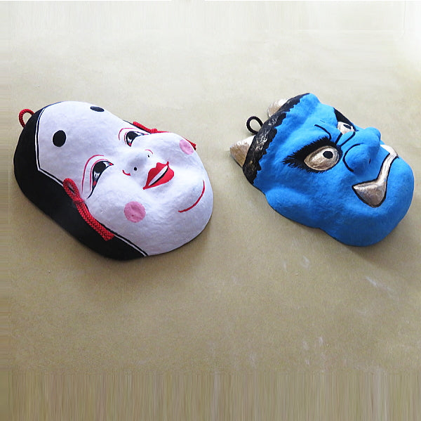 Ensemble de peinture de masques Kagura d'art populaire 青鬼(Aooni) & おたふく(Otafuku) Masque en papier mâché/Fait à la main