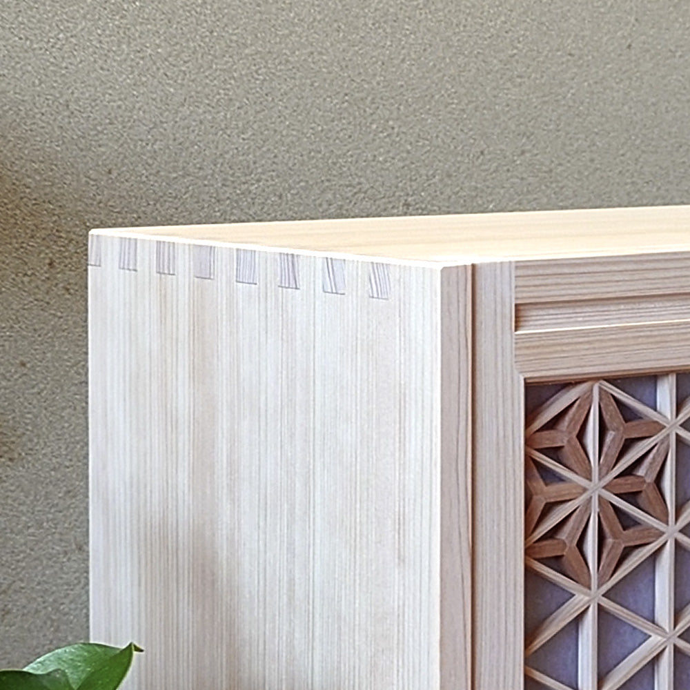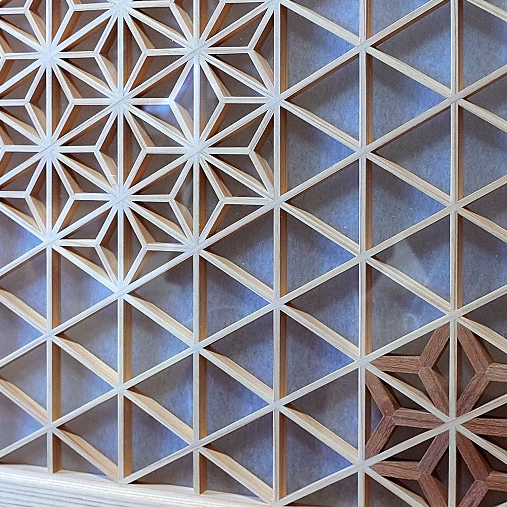 Matériaux : Hinoki (cyprès), cerisier (utilisé dans le cadre du motif Kumiko), panneau acrylique